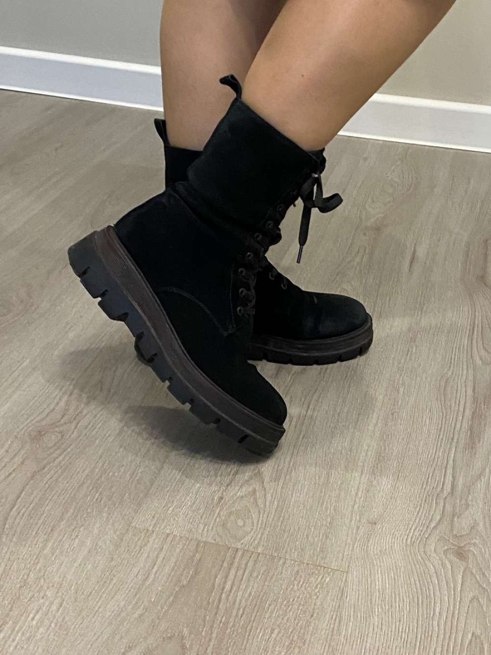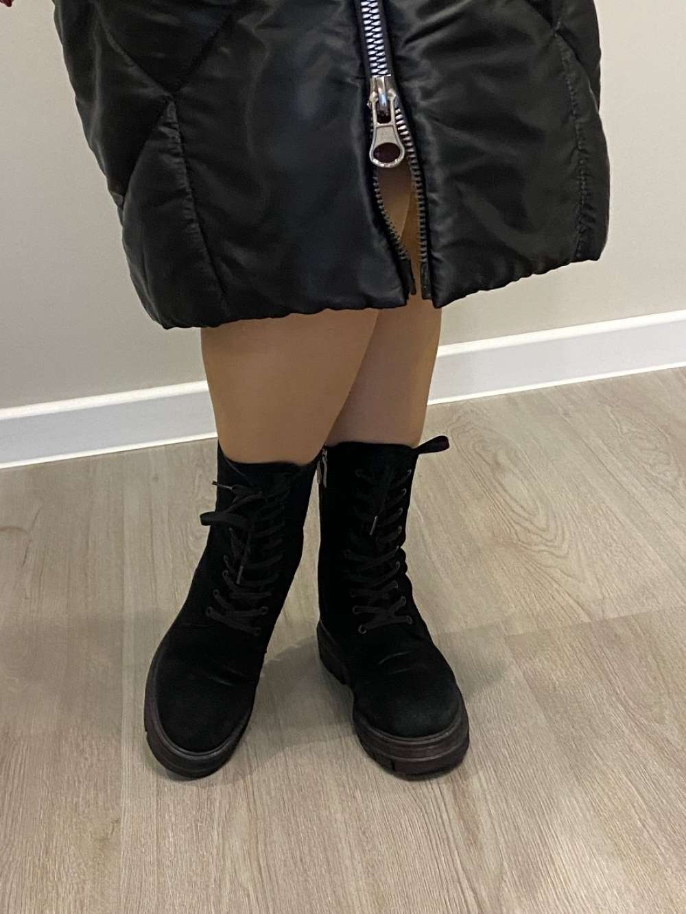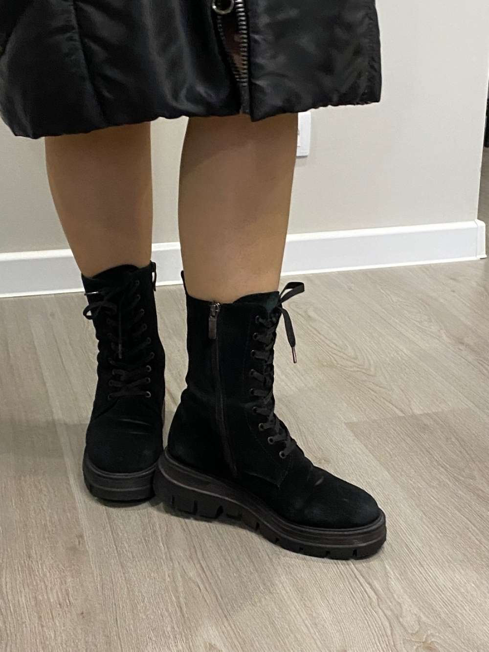 Женские зимние ботинки, верх- замша, внутри- шерстяной мех, противоскользящий протектор, высота каблука 5 см, высота подошвы 3 см, полнота регулируется шнуровкой. Размер 38, очень теплые. Цена 1200 руб