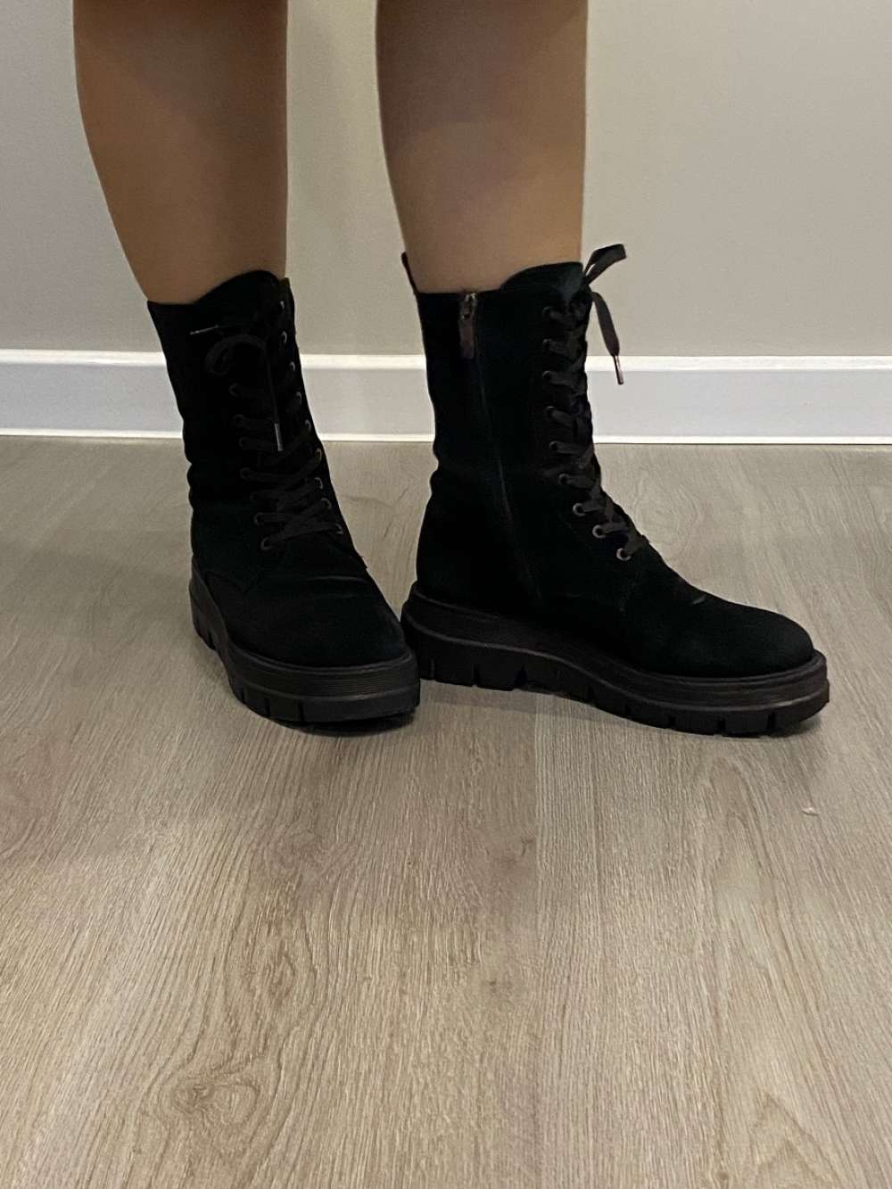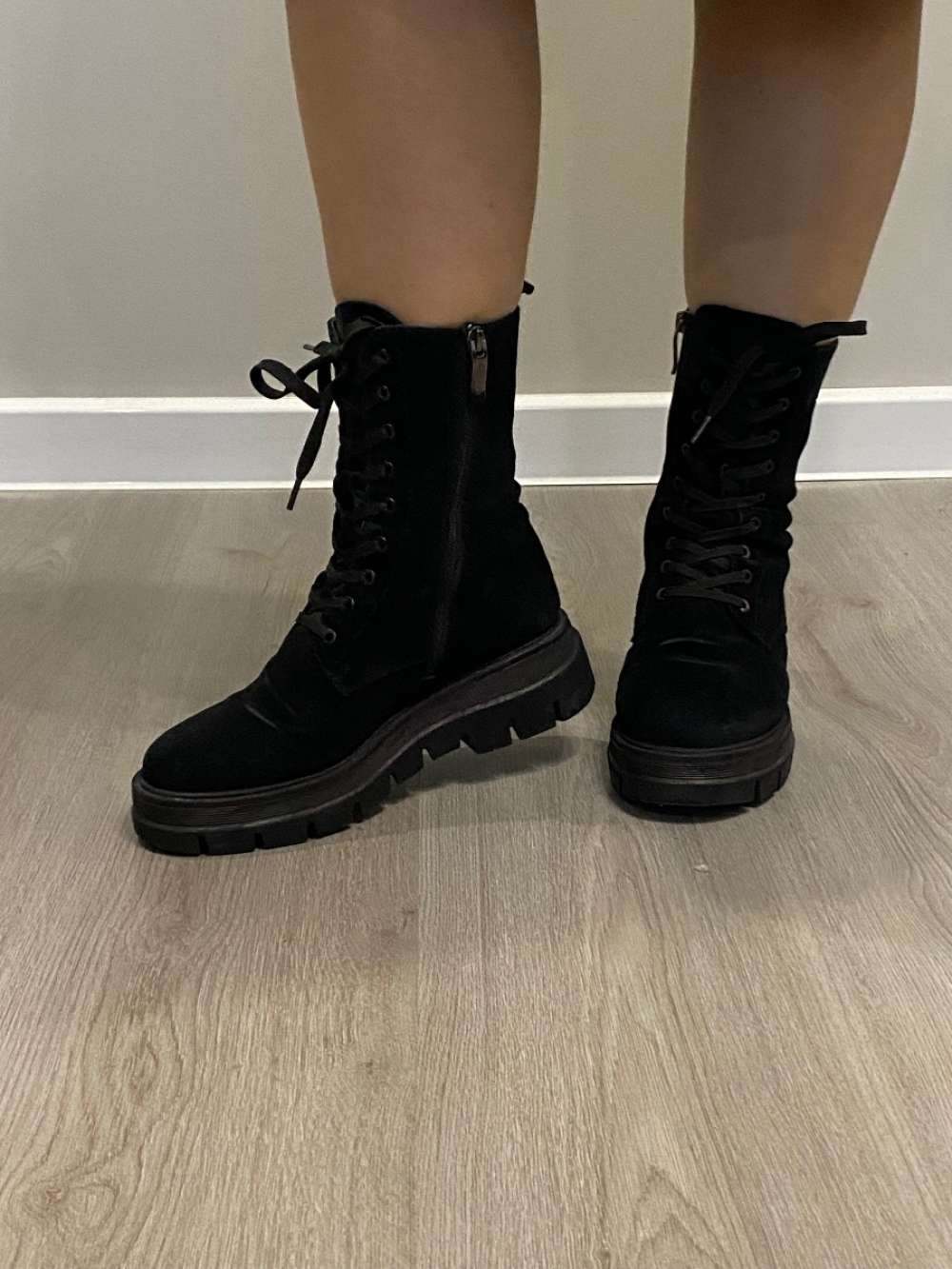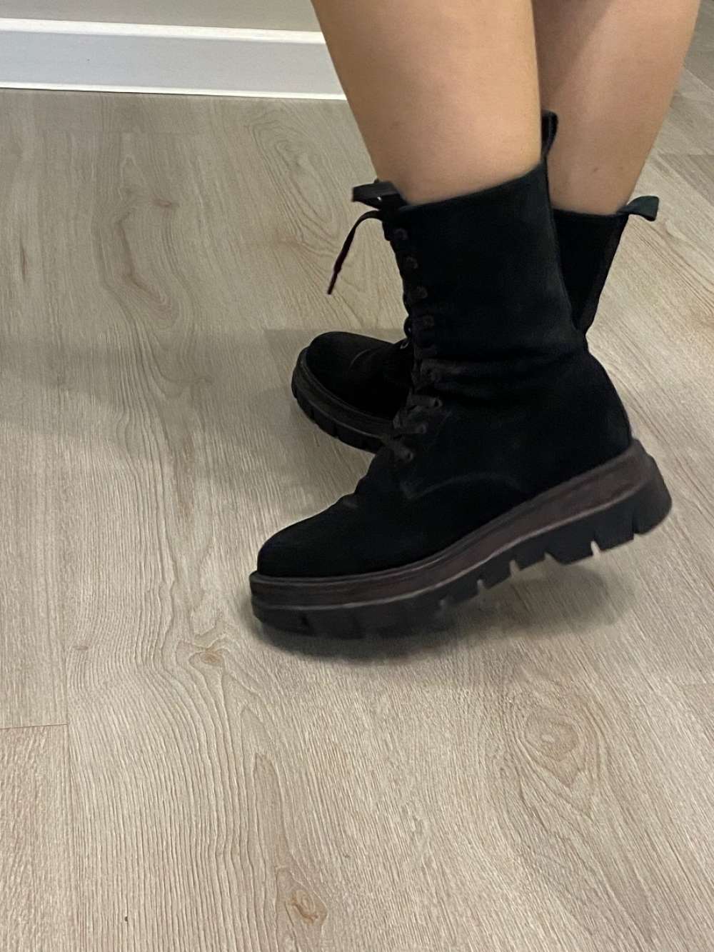 Женские зимние ботинки, верх- замша, внутри- шерстяной мех, противоскользящий протектор, высота каблука 5 см, высота подошвы 3 см, полнота регулируется шнуровкой. Размер 38, очень теплые. Цена 1200 руб