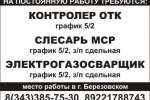 Контролер ОТК, слесарь МСР, электрогазосварщик, г. Березовский