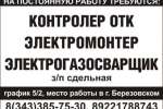 Контролер ОТК, электромонтер, электрогазосварщик, г. Березовский