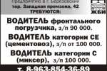 Водитель фронтального погрузчика, водитель категории СЕ (цементовоз), водитель категории С (миксер), г. Березовский