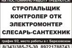 Стропальщик, контролер ОТК, электромонтер, слесарь-сантехник, г. Березовский