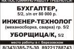Бухгалтер, инженер-технолог, уборщица, г. Березовский