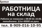 Требуется работница на склад, г.березовский