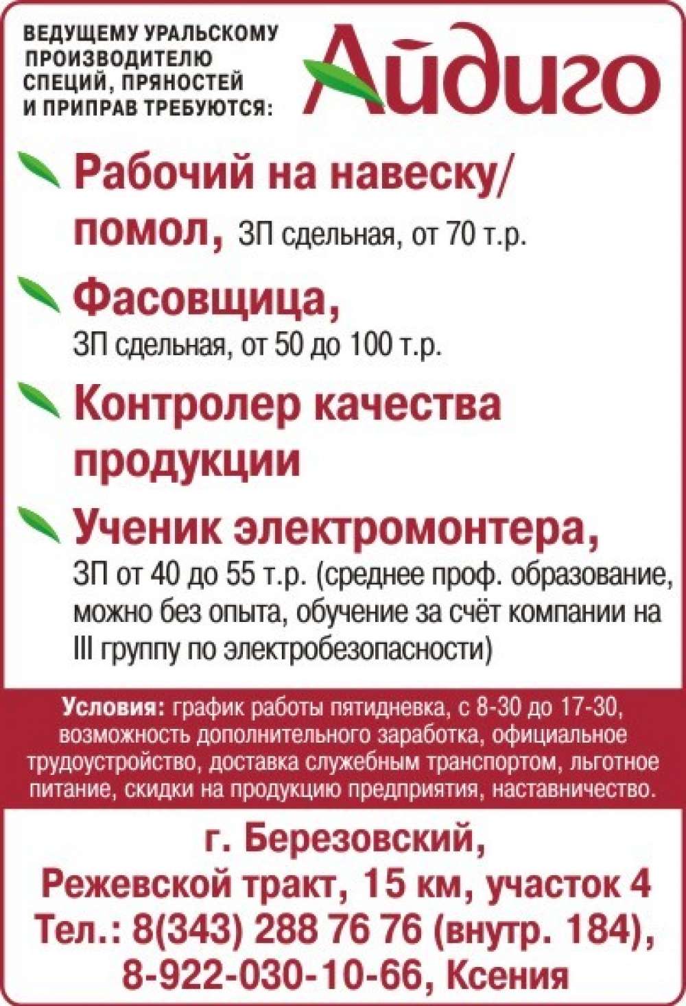 Рабочий на навеску/помол, фасовщица, контролер качество продукции, ученик электромонтера, г. Березовский