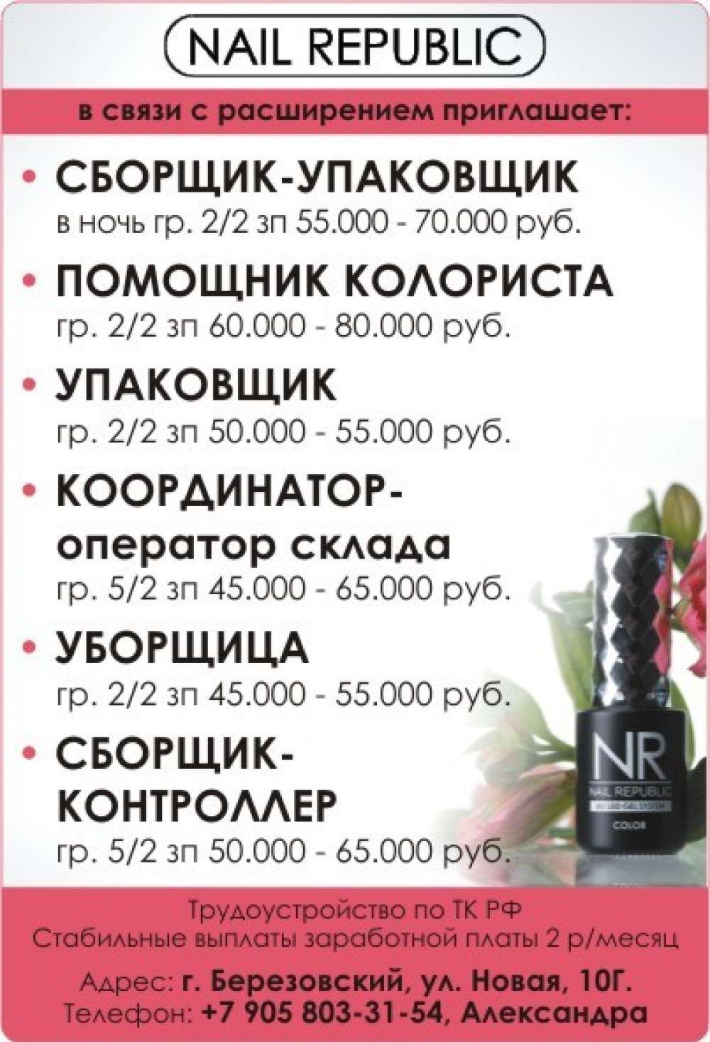 Сборщик-упаковщик, помощник колориста, упаковщик, координатор-оператор склада, уборщица/к, сборщик-контролер, г. Березовский
