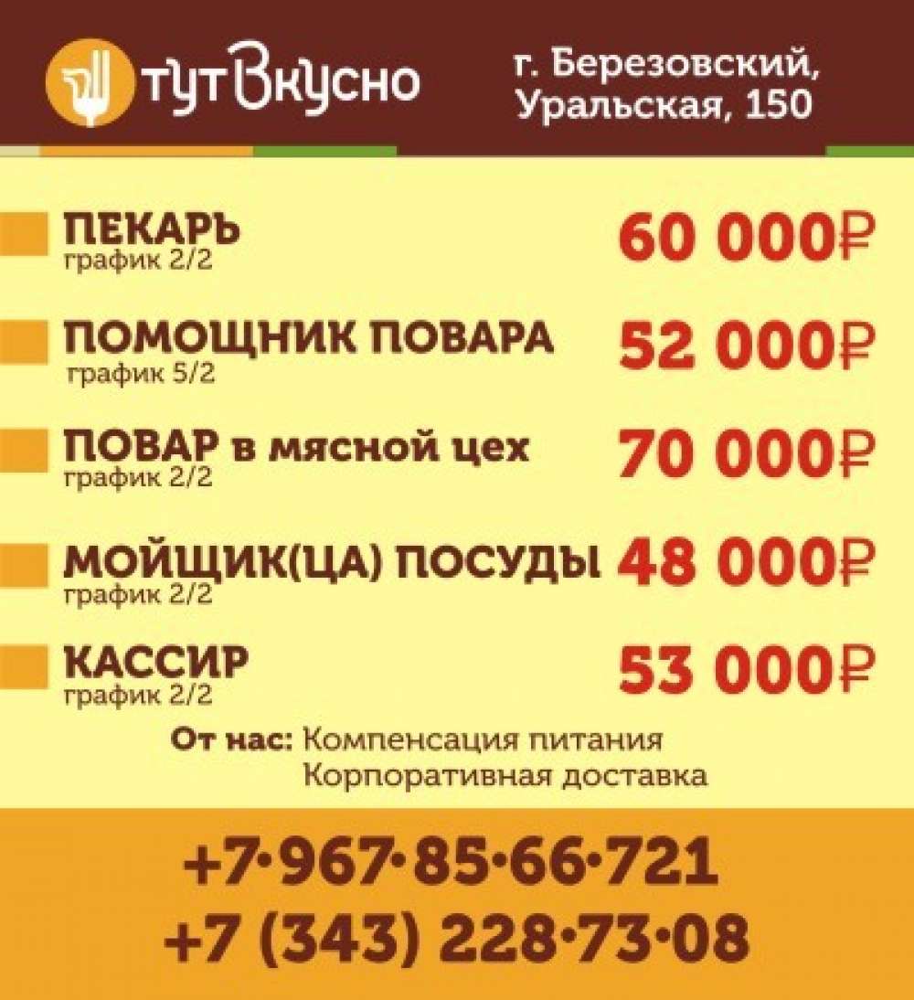 Пекарь, помощник пекаря, повар в мясной цех, мойщица посуды, кассир, г. Березовский