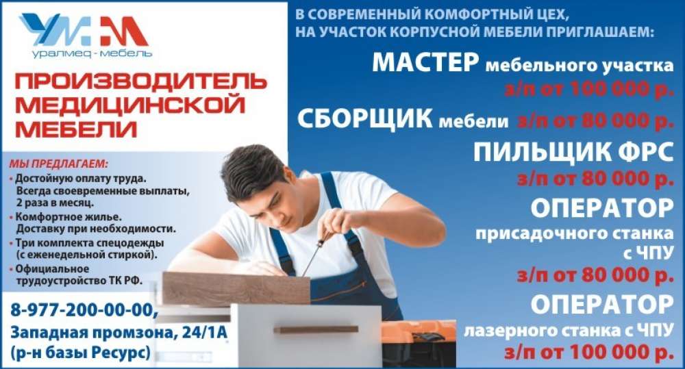 Мастер мебельного участка, сборщик мебели, пильщик ФРС, оператор присадочного станка с ЧПУ, оператор лазерного станка с ЧПУ, г. Березовский