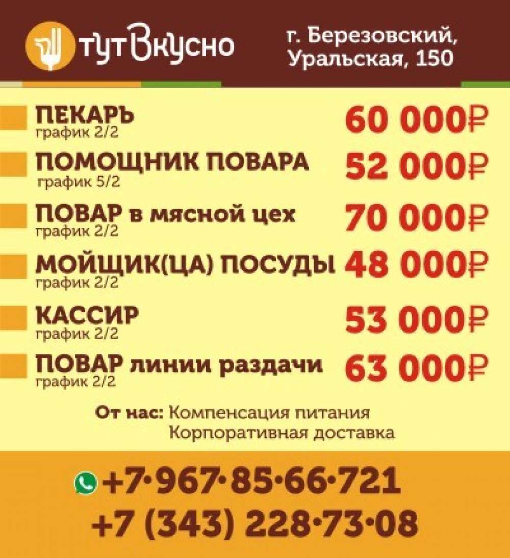 Пекарь, помощник повара, повар в мясной цех, мойщица посуды, кассир, повар линии подачи, г. Березовский
