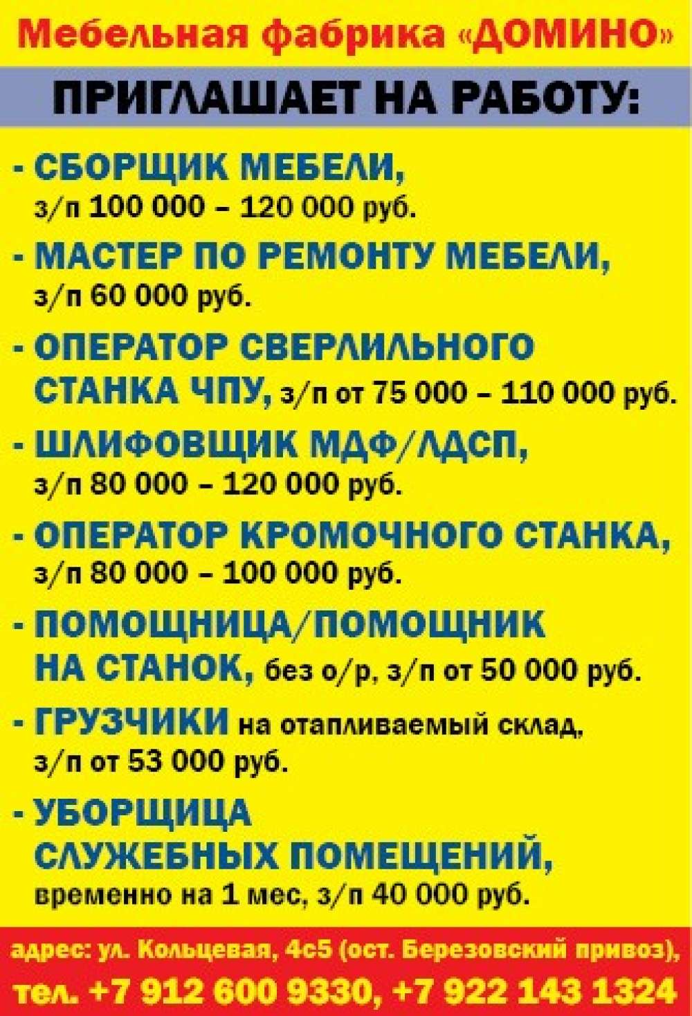 сборщик мебели, мастер по ремонту мебели, оператор сверлильного станка чпу, шлифовщик мдф/лдсп, оператор кромочного станка, помощница на станок, грузчики, уборщица служебных помещений, г. Березовский