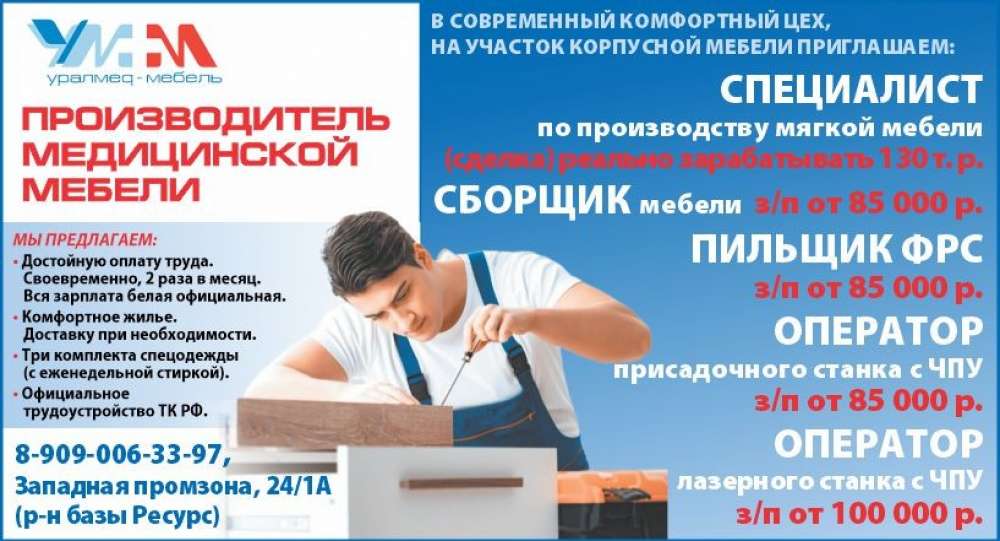 Специалист по производству мягкой мебели, сборщик мебели, пильщик ФРС, оператор присадочного станка с ЧПУ, оператор лазерного станка с ЧПУ, г. Березовский