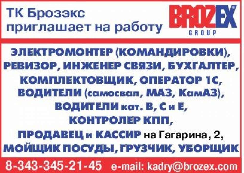 Электромонтер, ревизор, инженер связи, бухгалтер, комплектовщик, оператор 1С, водители (самосвал, МАЗ, КамАЗ)водители кат. В,С,Е, контролер КПП, продавец и кассир на Гагарина2, мойщик посуды, грузчик, уборщик, г. Березовский