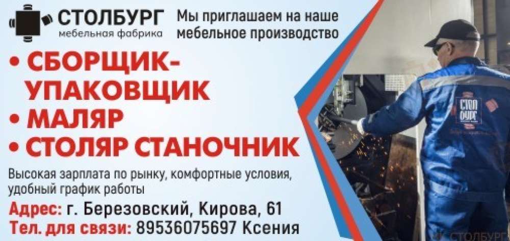Сборщик-упаковщик, маляр, столяр станочник, г. Березовский