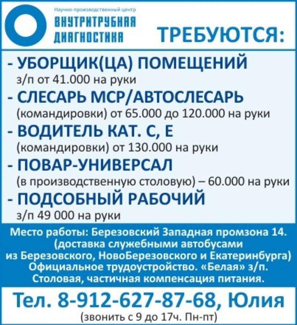Уборщик/ца помещений, слесарь МСР/автослесарь, водитель кат. С,Е, повар-универсал, подсобный рабочий, г. Березовский