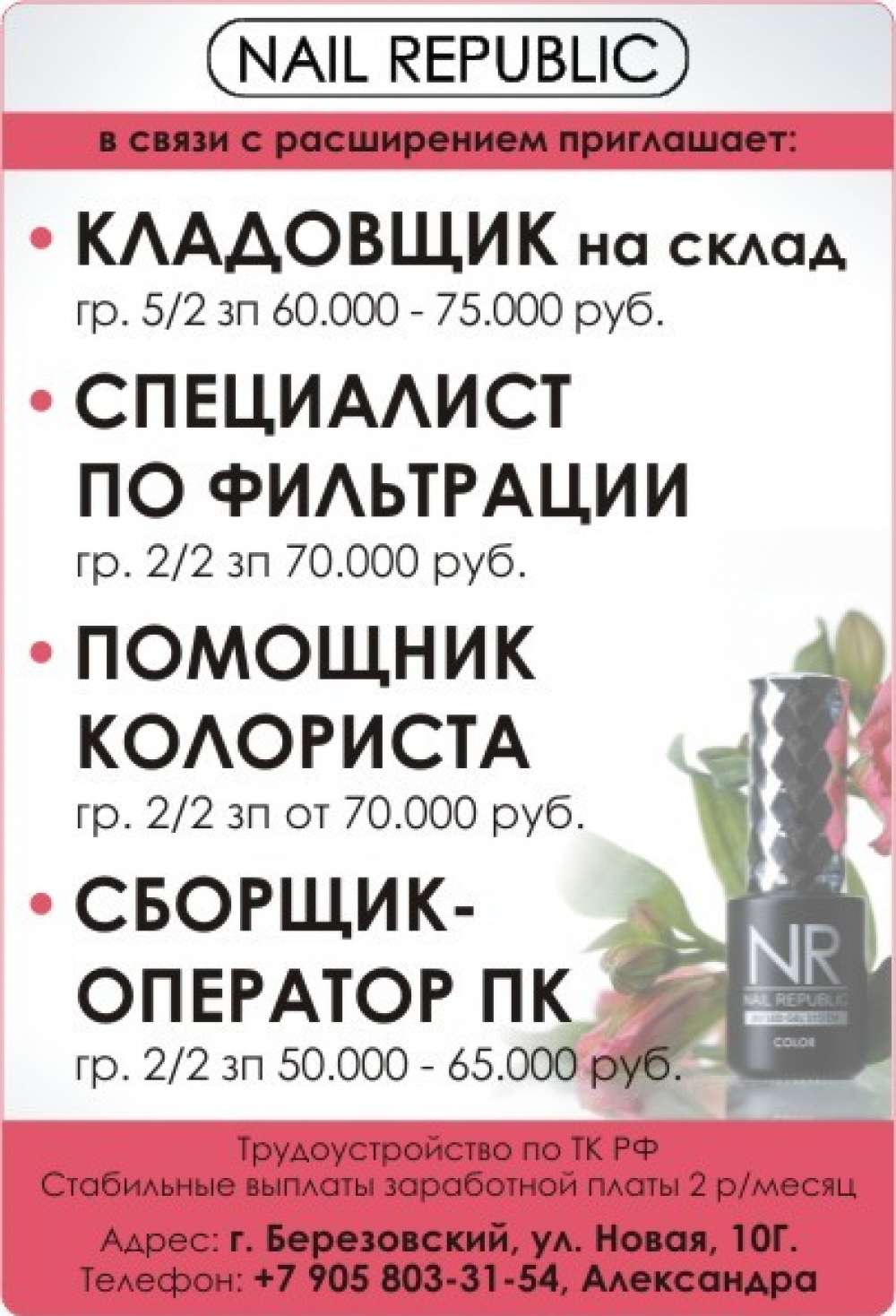 Кладовщик, специалист по фильтрации, помощник колориста, сборщик-оператор ПК, г. Березовский