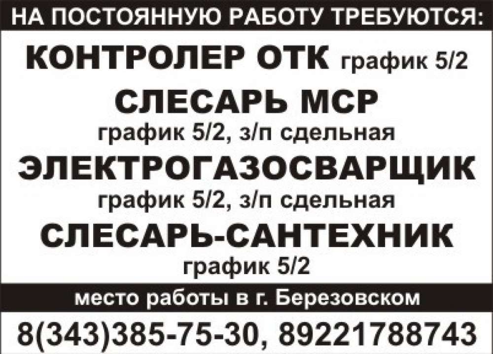 Контролер ОТК, Слесарь МСР, электрогазосварщик, слесарь-сантехник, г. Березовский