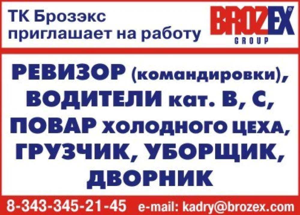 Ревизор (командировки), водители кат. В,С, повар холодного цеха, грузчик, уборщик, дворник, г. Березовский
