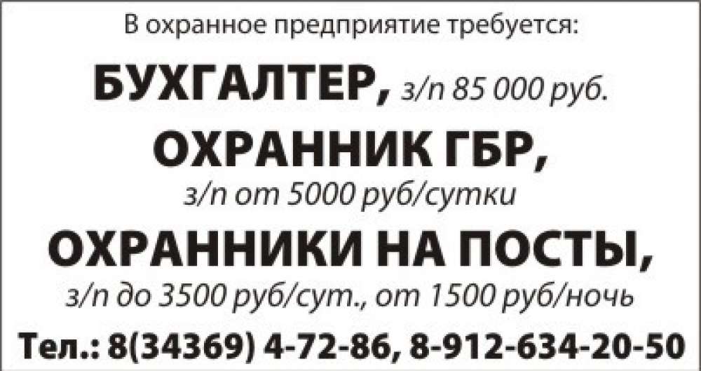 Требуется бухгалтер, охранник ГБР, охранники на посты, г.Березовский