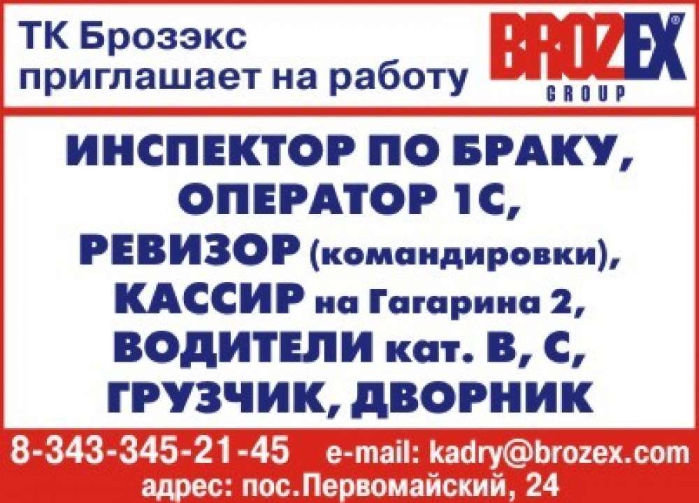 Инспектор по браку, оператор 1С, ревизор (командировки), кассир на Гагарина 2, водители кат. В,С, грузчик, дворник, г. Березовский