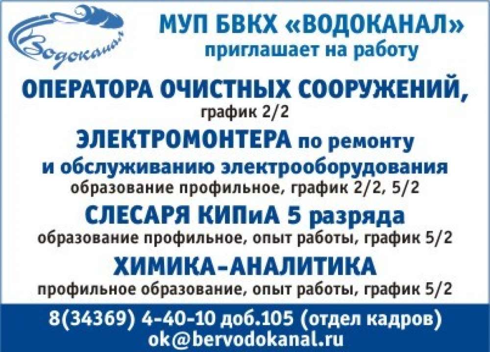 Оператор очистных сооружений, электромонтер по ремонту и обслуживанию электрооборудования, слесарь КИПиА, химик-аналитик, г. Березовский