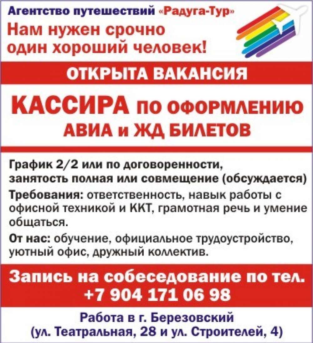 Кассир по оформлению АВИА и ЖД билетов, г. Березовский
