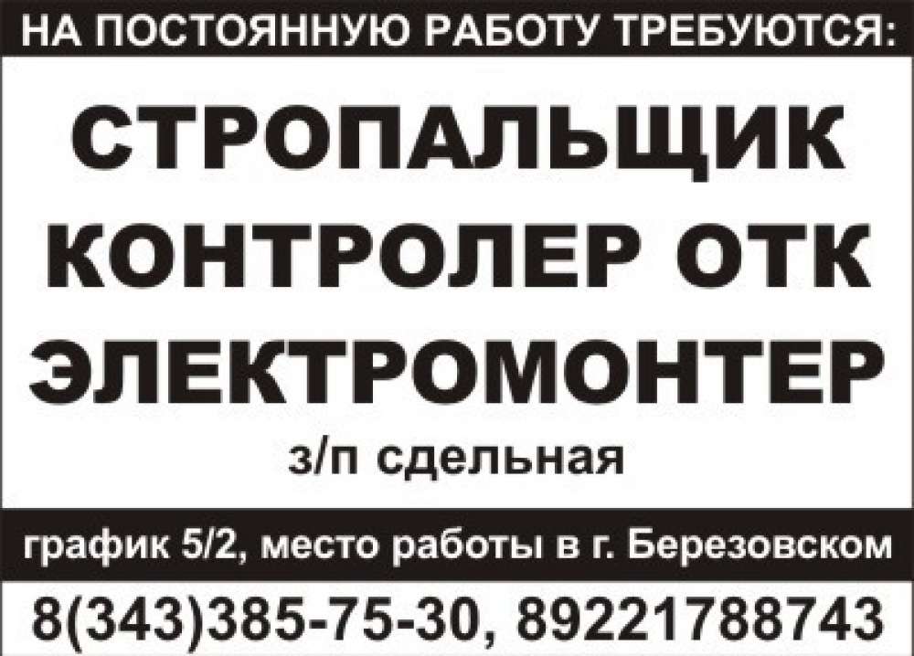 Стропальщик, контролер ОТК, электромонтер, г. Березовский