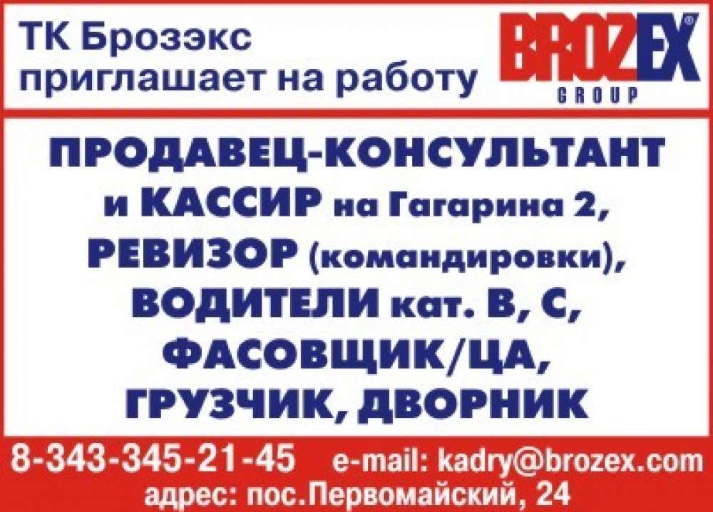 Продавец-консультант и кассир на Гагарина2, ревизор (командировки), водители кат.В,С, фасовщик/ца, грузчик, дворник, г. Березовский