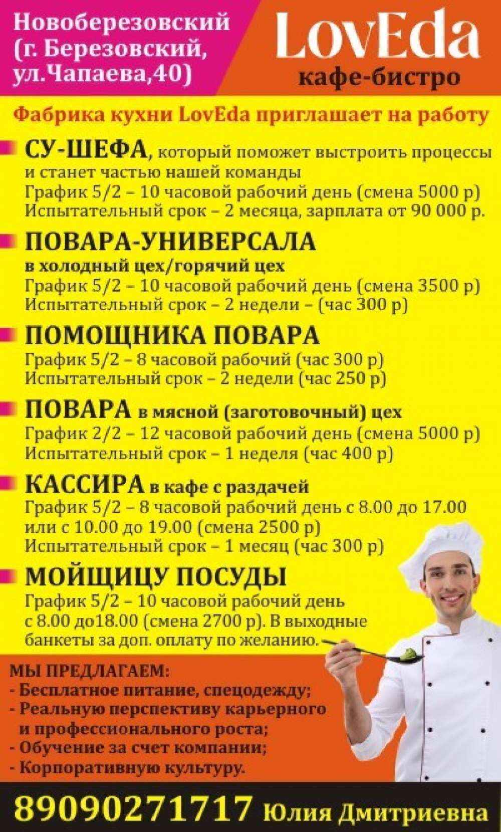 Су-шеф, повар-универсал, помощник повара, повар, кассир, мойщик посуды, г. Березовский
