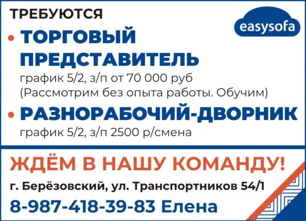 Требуется торговый представитель, разнорабочий-дворник, г.Березовский