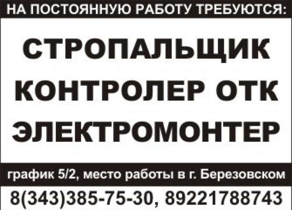 Стропальщик, контролер ОТК, электромонтер, г. Березовский