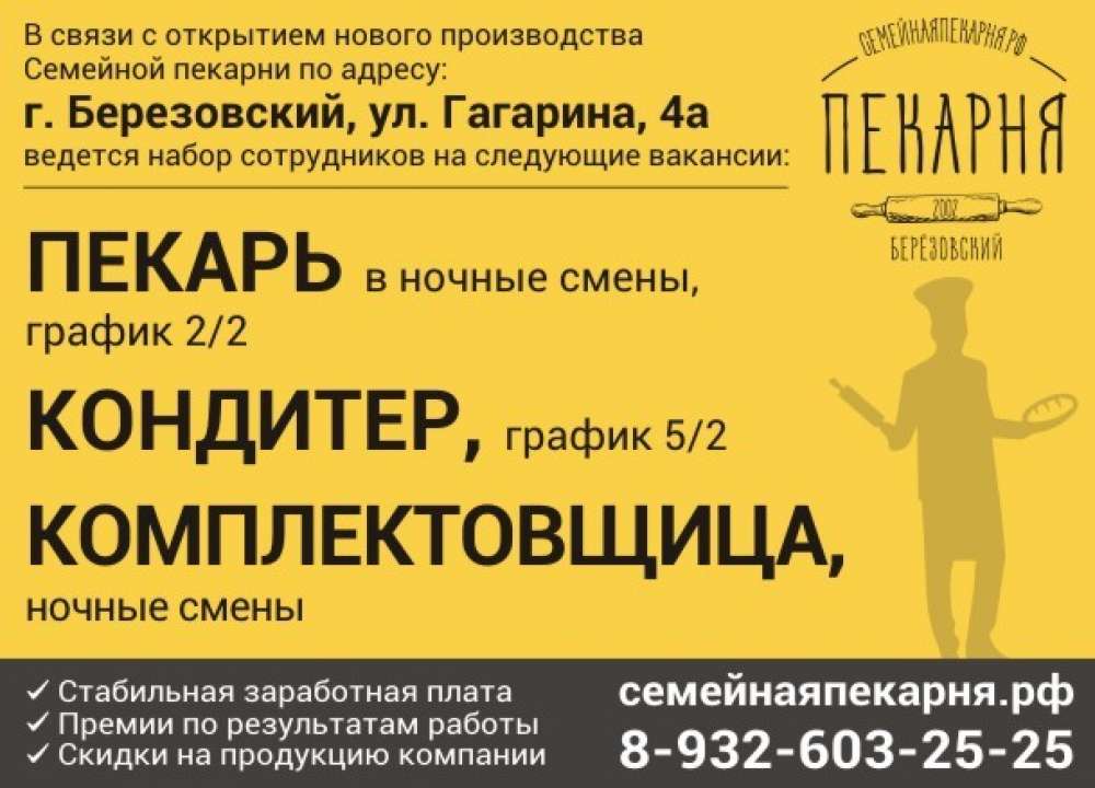 Требуется пекарь, кондитер, заготовщица, г.Березовский