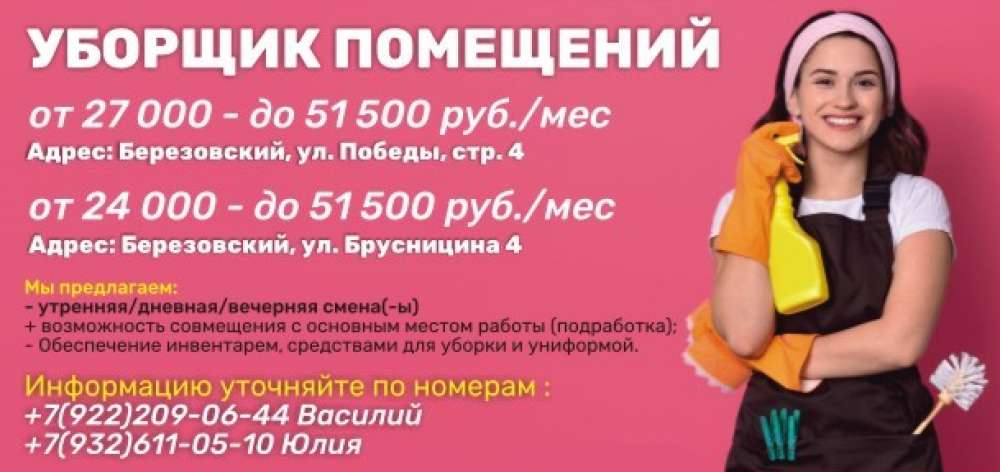 ТРЕБУЕТСЯ УБОРЩИК ПОМЕЩЕНИЙ, г. Березовский