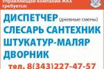 Диспетчер, слесарь сантехник, штукатур-маляр, дворник, г. Березовский